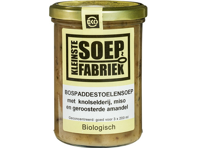 Soep zoals het bedoeld is: op ouderwetse manier met tijd, zorg en aandacht bereid. Deze bospaddenstoelensoep is lekker vol en romig, gemaakt met biologische paddenstoelen, knolselderij, geroosterde amandel en miso. Aanlengen met 200 ml (half potje) water.