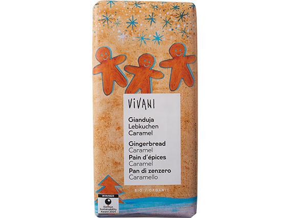 De beste kerstsmaken in één reep: De Gianduja Gingerbread Caramel-variant, alleen verkrijgbaar in de winter, bevat heerlijke stukjes gemberkoek en zoete karamel, maar ook knapperige kaneel en geurige gemberkoekkruiden. Omhuld met smeltende Gianduja nougatchocolade met 32% cacao, is deze creatie perfect voor de winter. 100% biologisch en ecologisch verpakt, met een artistiek ontwerp van kunstenares Annette Wessel.