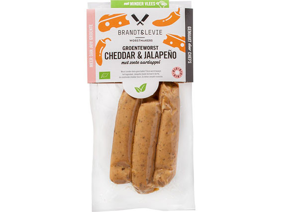 De missie van Brandt & Levie is niet alleen beter vlees, maar óok minder vlees. Daarom maken zij ook heerlijke vega worsten boordevol groenten, peulvruchten, havermout, zaden en pitten. Deze variant is gemaakt met zoete aardappel. De jalapeño geeft de worst een pittige smaak, die de smeltende cheddar blust. Lekker in een burrito of wrap, met aardappeltjes en groene salade en bij de stamppot.