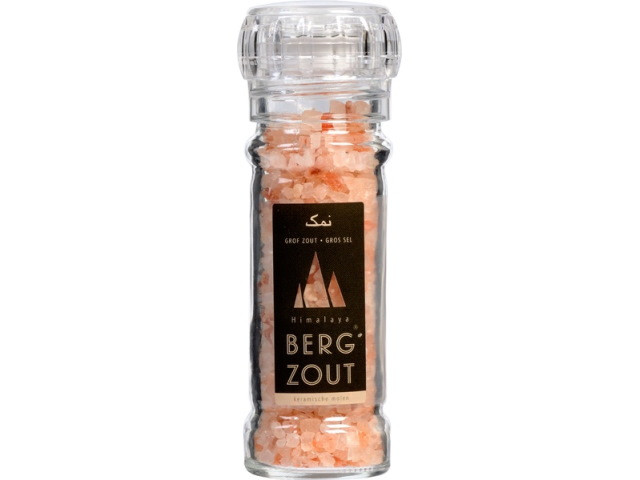 Himalayazout in een keramische molen. De molen is eenvoudig na te vullen met de de navulverpakking. Het zout wordt door Bergzout handmatig geselecteerd in de mijn. Ideaal om gerechten mee op smaak te brengen!