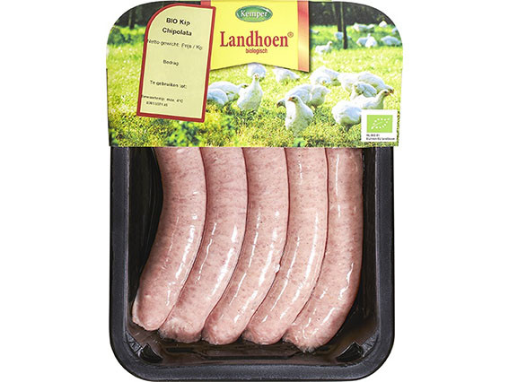 Ingredienten: kippenvlees* (99%), zeezout, korianderzaad*, gember*, zwarte peper*, schapensnaar natuurdarm.* = Biologisch