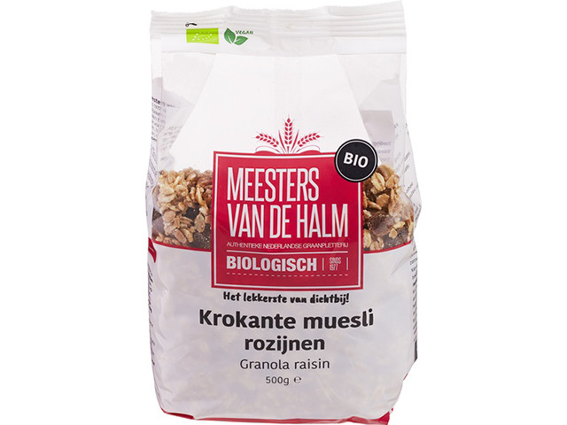Ingredienten: 4-korenvlokken* (TARWEvlokken*, HAVERvlokken*, GERSTvlokken*, ROGGEvlokken*), 10.0% rozijnen* (10.0% rozijnen*, zonnebloemolie*), rietsuiker*, TARWEstroop* , zonnebloemolie*, TARWEbloem*, TARWEzemelen*.* = Biologisch
