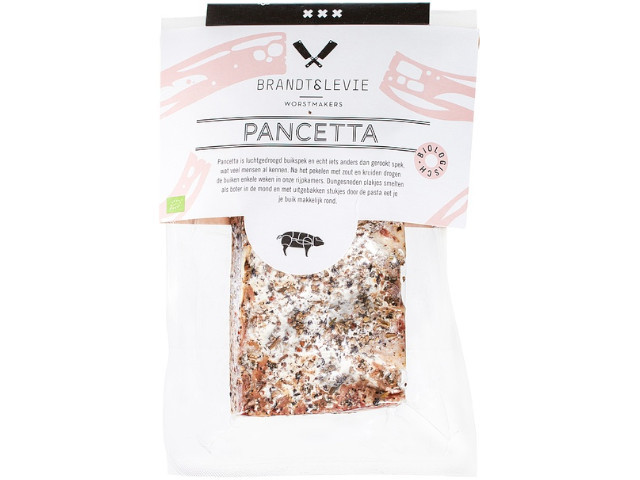 Pancetta is luchtgedroogde buikspek en echt iets anders dan gerookte spek. Na het pekelen met zout en kruiden drogen de buiken enkele weken in de rijpkamers van Brandt & Levie. Pancetta smaakt heerlijk in bijvoorbeeld pasta's en de plakjes smelten in je mond. De varkens van Brandt & Levie groeien op een zo vrij mogelijke manier op bij Nederlandse biologische boeren, die voldoen aan de hoogste standaard voor dierenwelzijn.