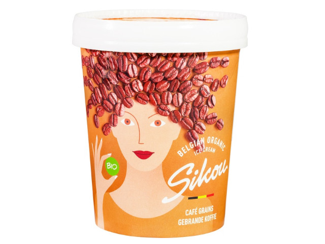 Ambachtelijk bio roomijs van gemalen koffiebonen (dus zonder aroma's), die in de atelier van Sikou in België wordt bereid. Het ijs wordt gemaakt van rauwe volle melk en rauwe room van Waalse boerderijen, dat in het atelier wordt gepastueristeerd. Het ijs heeft een bijzonder rijke smaak!