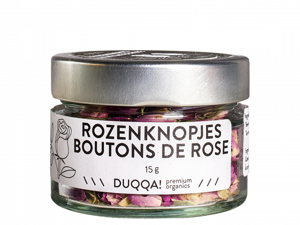 Deze rozenknopjes geuren heerlijk en zijn een genot voor het oog. Deze rozen zijn speciaal voor consumptie gekweekt; puur en onbespoten. De knoppen en bloemen worden met de hand geplukt en gedroogd. De knopjes zijn inzetbaar in combinatie met kersenjam, in de harissa voor over of bij de groente en bij gegrilde makreel. Ook lekker in het deeg van koekjes of ijs of maak eens rozenwater. De kruiden en specerijen(mixen) van Duqqa! zijn biologisch gecertificeerd en gemaakt om het dagelijkse koken meer smaak te geven. Kruiden met een verhaal!