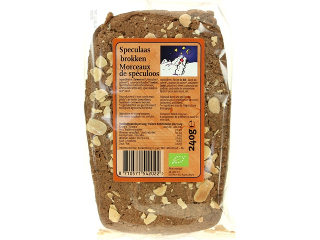 Ingredienten: TARWEmeel [GLUTEN ]*, rietsuiker*, ongehard palmvet*, AMANDELschaafsel [NOTEN]* (2,3%), rijsmiddel (natriumbicarbonaat, ammoniumbicarbonaat), speculaaskruiden (kaneel)*, zout. * = Biologisch