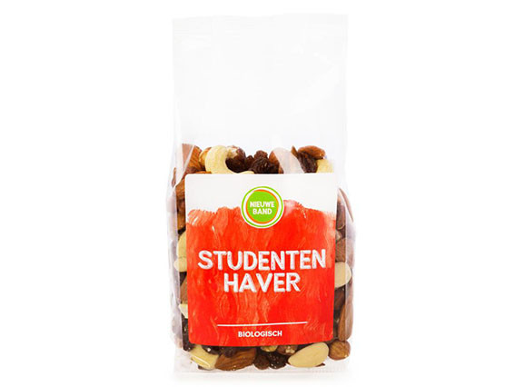 Deze studentenhaver is een mix van rauwe en ongezouten noten en zuidvruchten, met een hoog aandeel noten. De verpakking is 100% recyclebaar; etiketten mogen bij papier en de zak mag bij plastic afval.