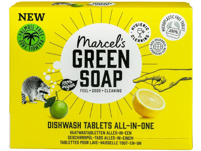 Deze alles-in-één vaatwastabletten van Marcel's Green Soap zitten bomvol natuurlijke ingrediënten, zijn 100% plasticvrij en plantaardig. Ze zijn minstens 97% biologisch afbreekbaar en zitten verpakt in een oplosbaar folie van maïszetmeel. Met de heerlijk frisse geur van grapefruit en limoen.