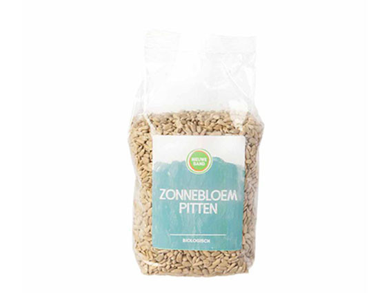 Gepelde zonnebloempitten uit biologische teelt. Per 500 gram verpakt. De verpakking is 100% recyclebaar; etiketten mogen bij papier en de zak mag bij plastic afval.