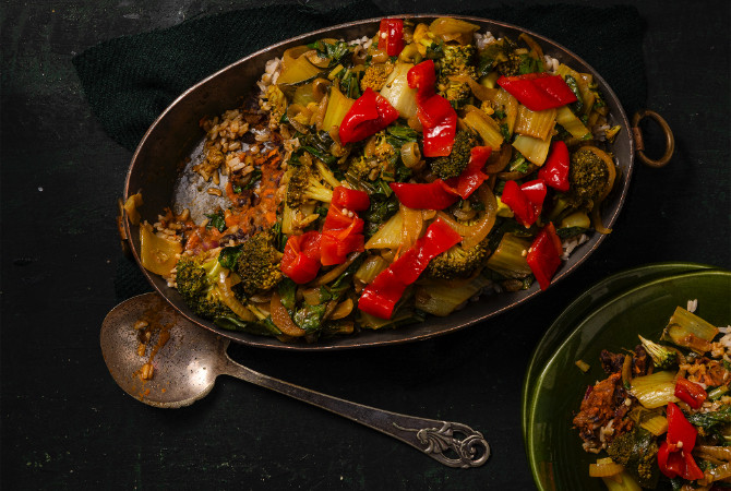 Haal de gare pompoenblokjes en puntpaprika’s uit de oven.