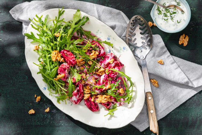 Heerlijke en prachtige salade. Vouw de bietjes door de dressing zodat je een gemarmerd effect krijgt.