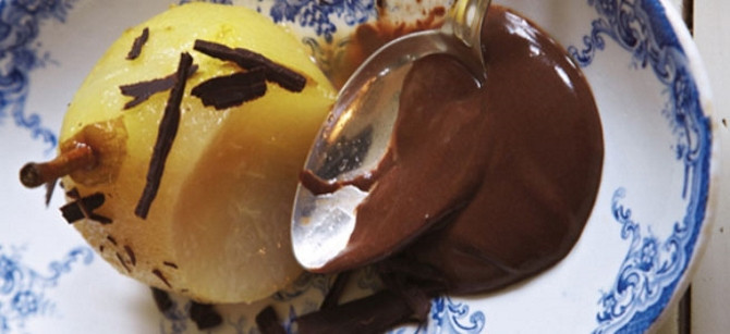 Zet de peren elk op een bord, lepel de wijnsiroop erover en giet de chocoladesaus eromheen.