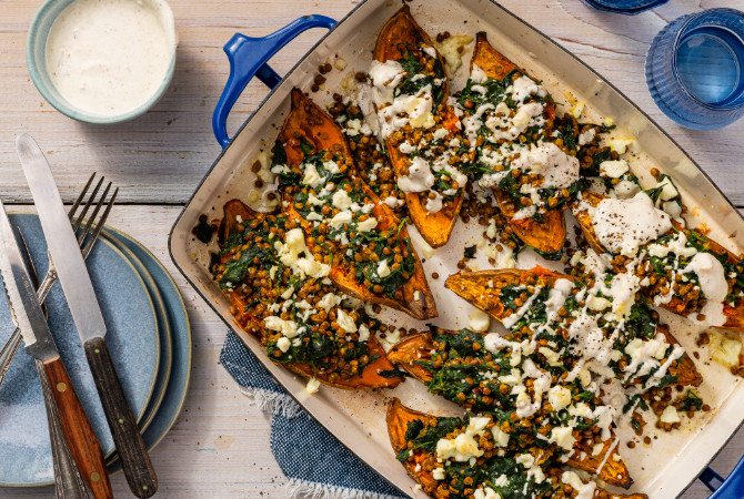 Haal de zoete aardappels uit de oven en rul de bovenste laag van de zoete aardappel met een vork. Verdeel het spinazie-mengsel over de zoete aardappels en verkruimel de feta eroverheen. Zet de ovenschaal nog 10-15 minuten terug in de oven.