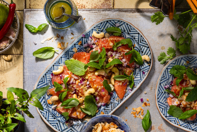 Dat ik vijftien jaar later een recept zou opschrijven, waarbij ik nog voor me zie hoe er een grote rijpe pomelo werd gepeld, zou ik nooit hebben kunnen voorspellen. De grapefruit salade is een combinatie van de kookkunst van de hardwerkende Shan vrouwen en van de fruitsalades die ik in Thailand heb gegeten in de jaren dat we daar woonden.