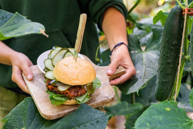 Rjimke uit Amsterdam haalde dit Vegan Burger-recept uit 'The Big! Bosh Burger - simple recipes - all plants". Hier presenteert tuinder-student Maaike de burger tussen haar komkommerplanten... :-)