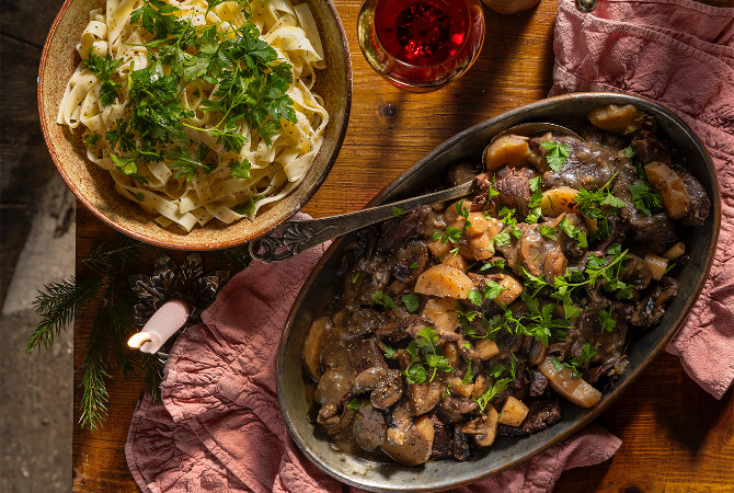 Serveer de stoof met de tagliatelle en verse peterselie.