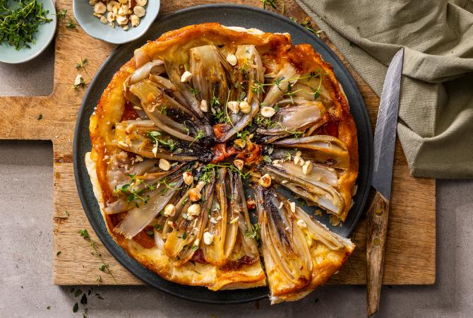 Lekker makkelijk taartje met jaarrond beschikbare Witlof met volop vitamine C, K en B en de mineralen kalium, calcium en ijzer.