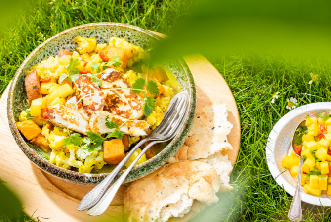 Schep de curry in kommen en verdeel de mangosalsa, halloumi en de rest van de koriander erover. Serveer het naanbrood erbij.