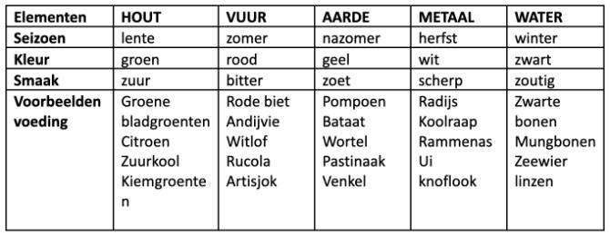 Om het niet al te ingewikkeld te maken beperk ik me nu even tot de verschillende elementen, het jaargetijde (5 i.p.v. 4), kleur en smaak. In een overzichtje ziet dat er dan zo uit: